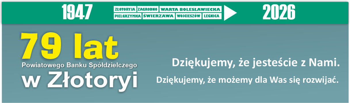 Ta strona wykorzystuje pliki cookies. Brak zmian ustawień przeglądarki oznacza zgodę na ich używanie. Administratorem danych jest Powiatowy Bank Spółdzielczy w Złotoryi. Więcej informacji o zmianie ustawień plików cookies w przeglądarce, zasadach przetwarzania danych, w tym o prawach dostępne jest w Polityce prywatności.